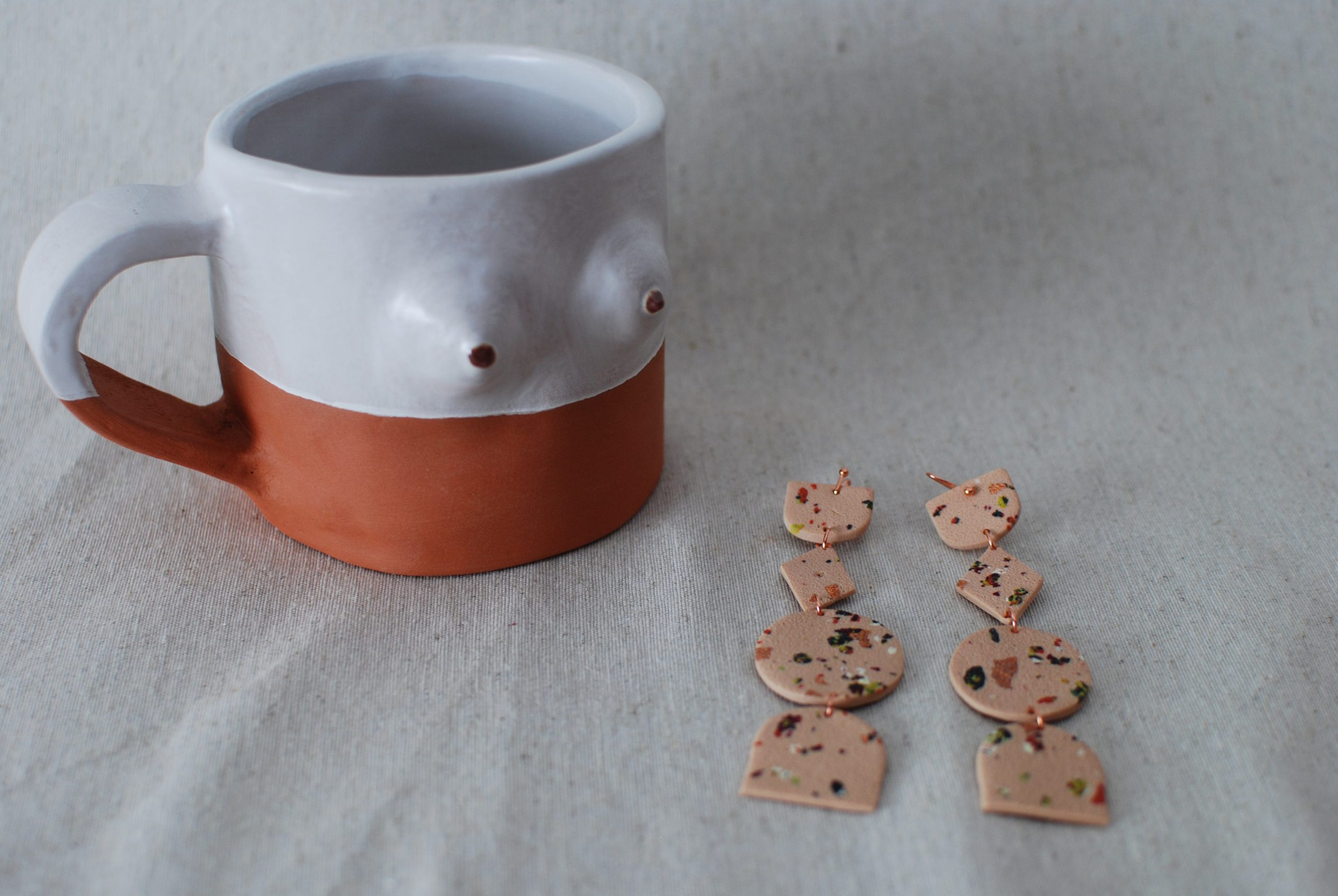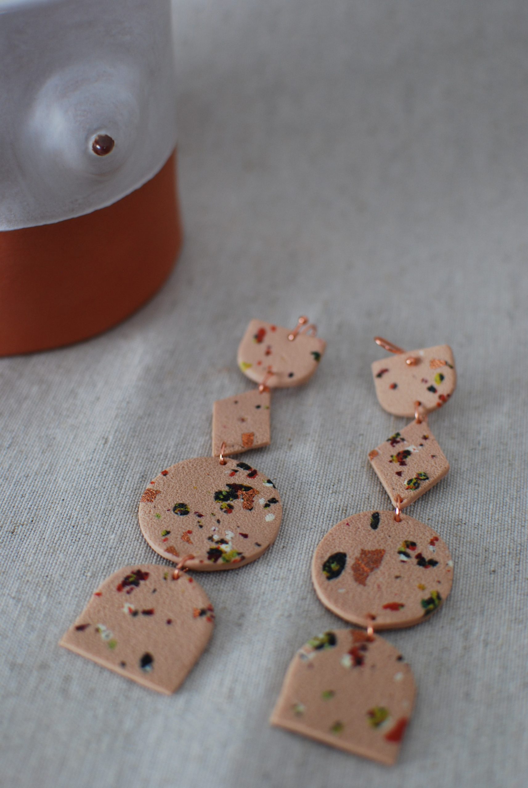Pendientes en arcilla polimérica con diseño terrazo en varios colores y tonos cobrizos.