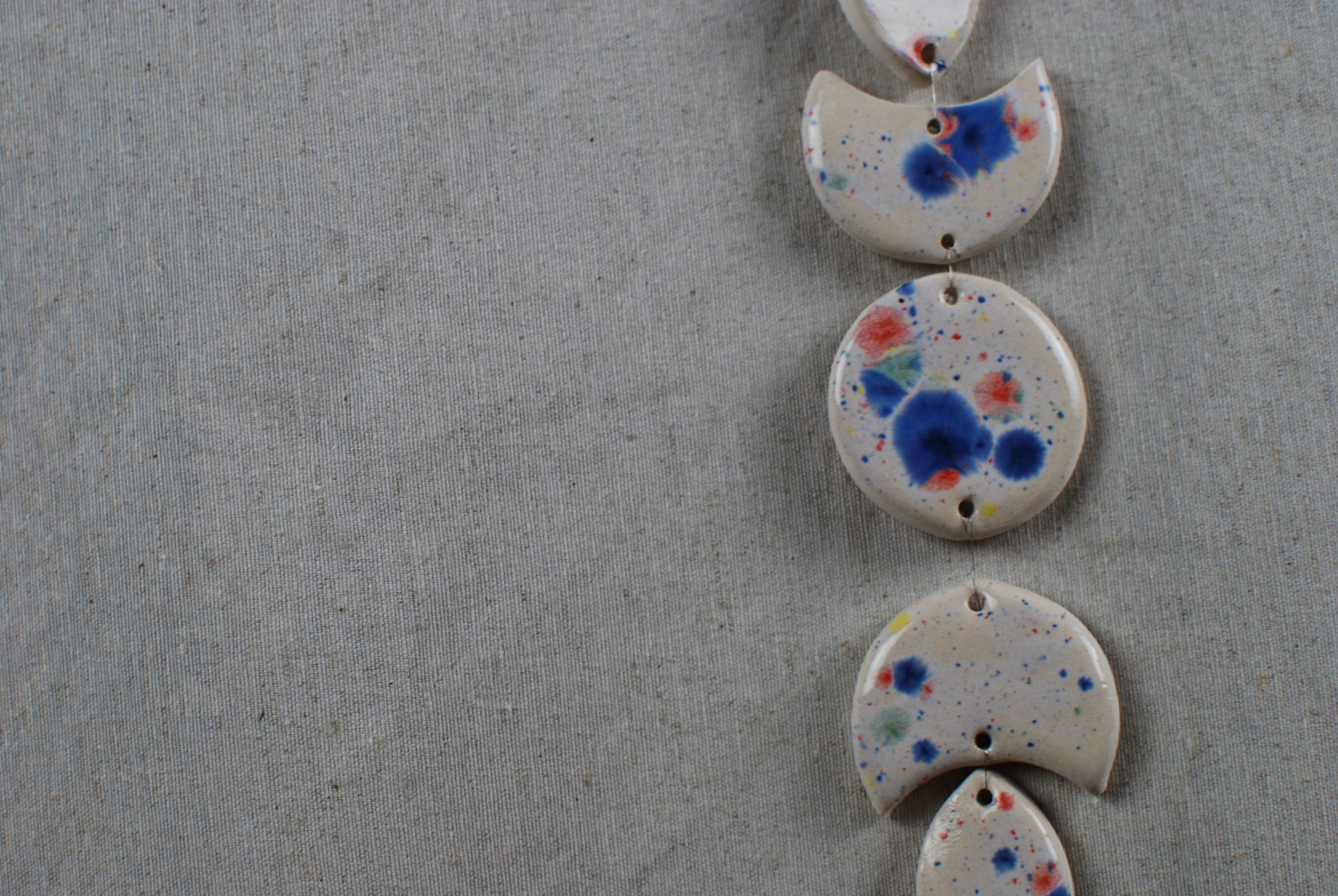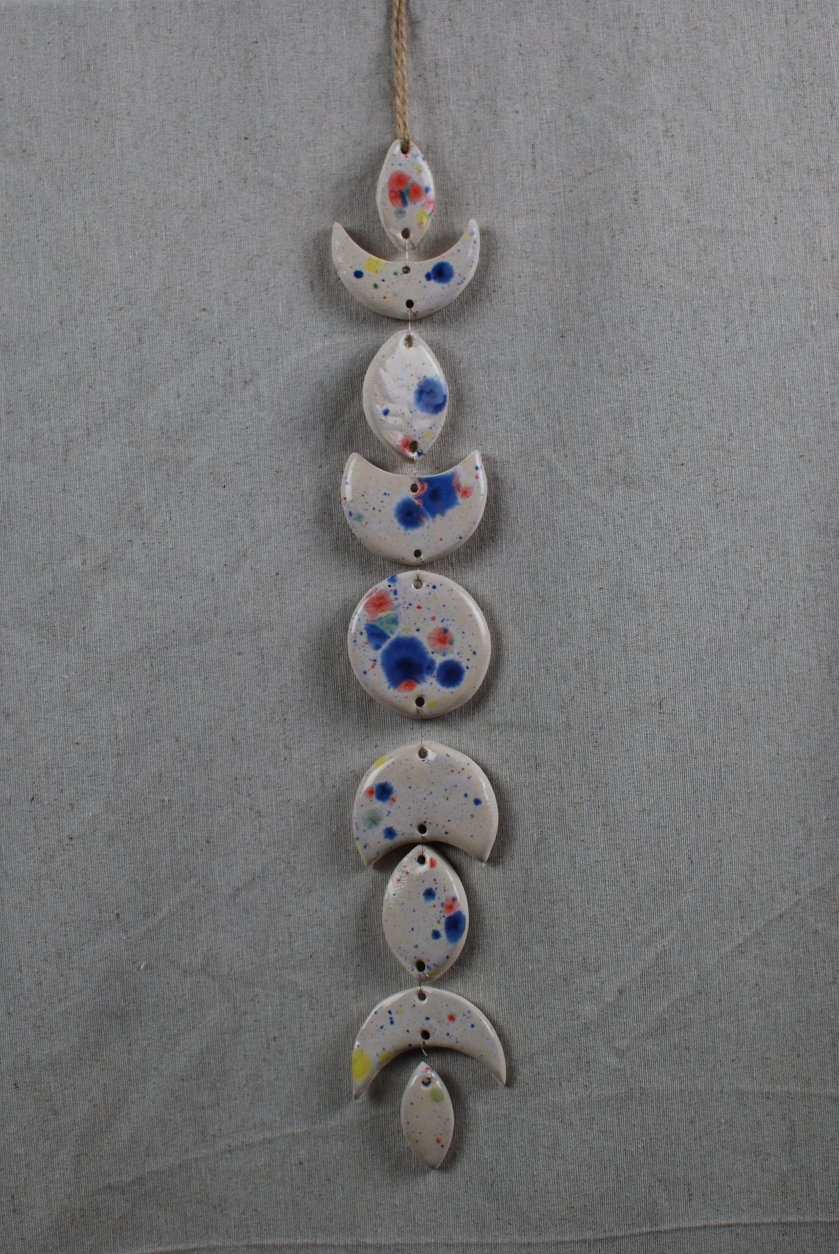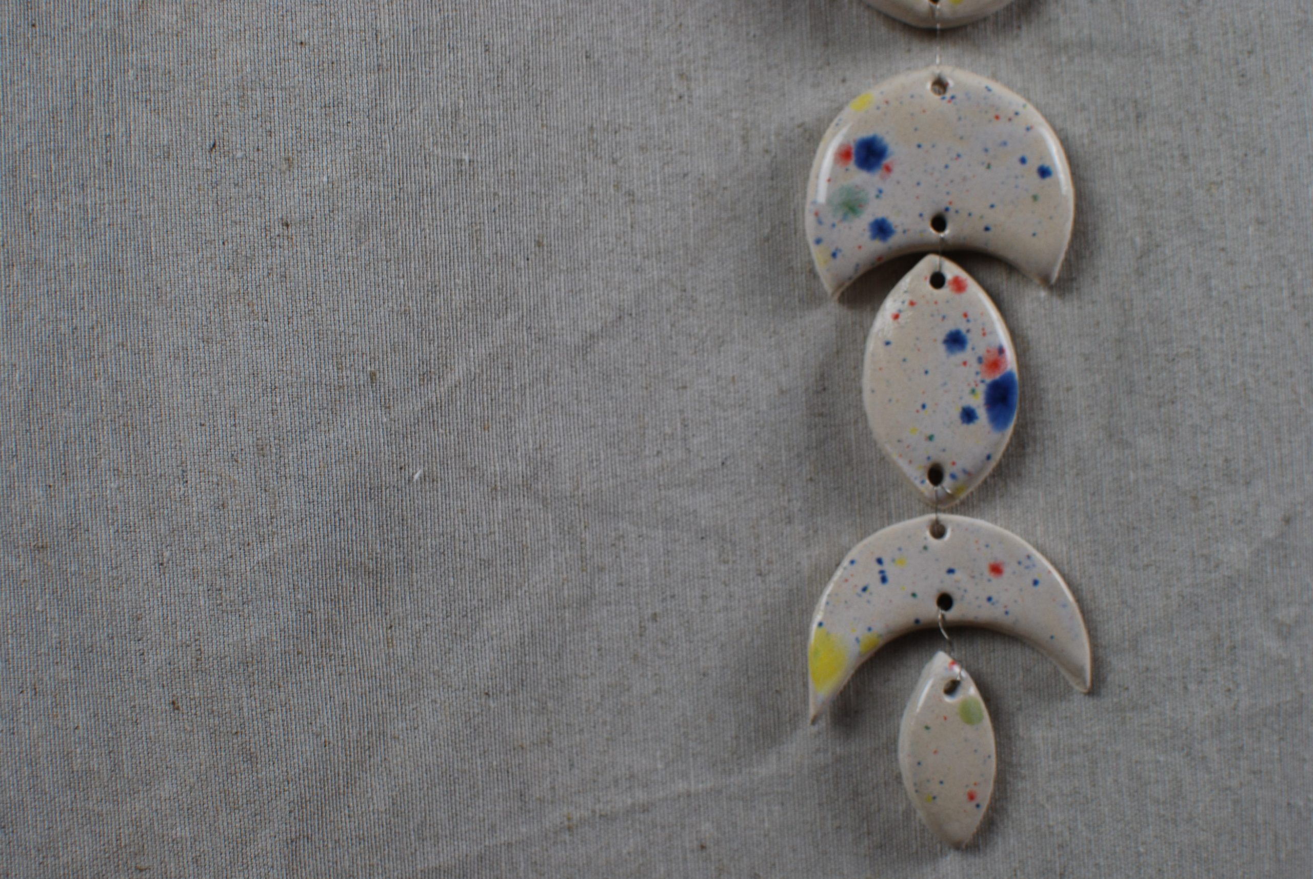 Diseño propio de una fase lunar en arcilla de baja temperatura esmaltada con estampado de diversos colores muy llamativos sobre loza blanca. Perfecto para colgar y dar color a una pared.