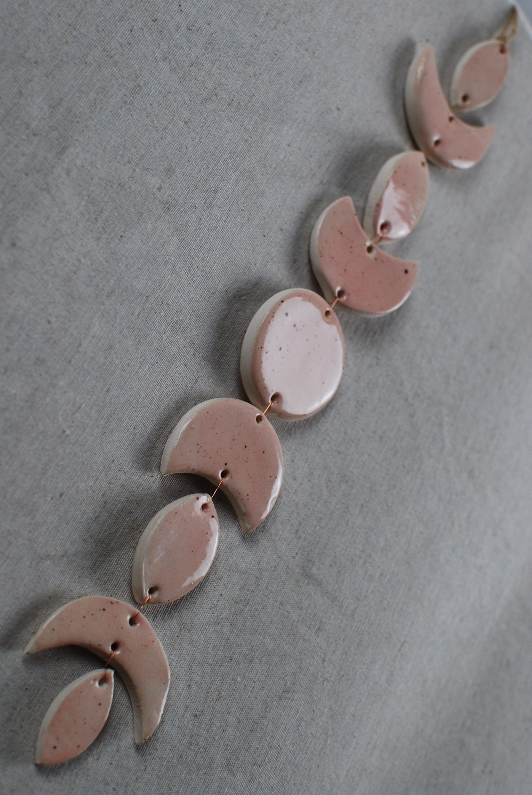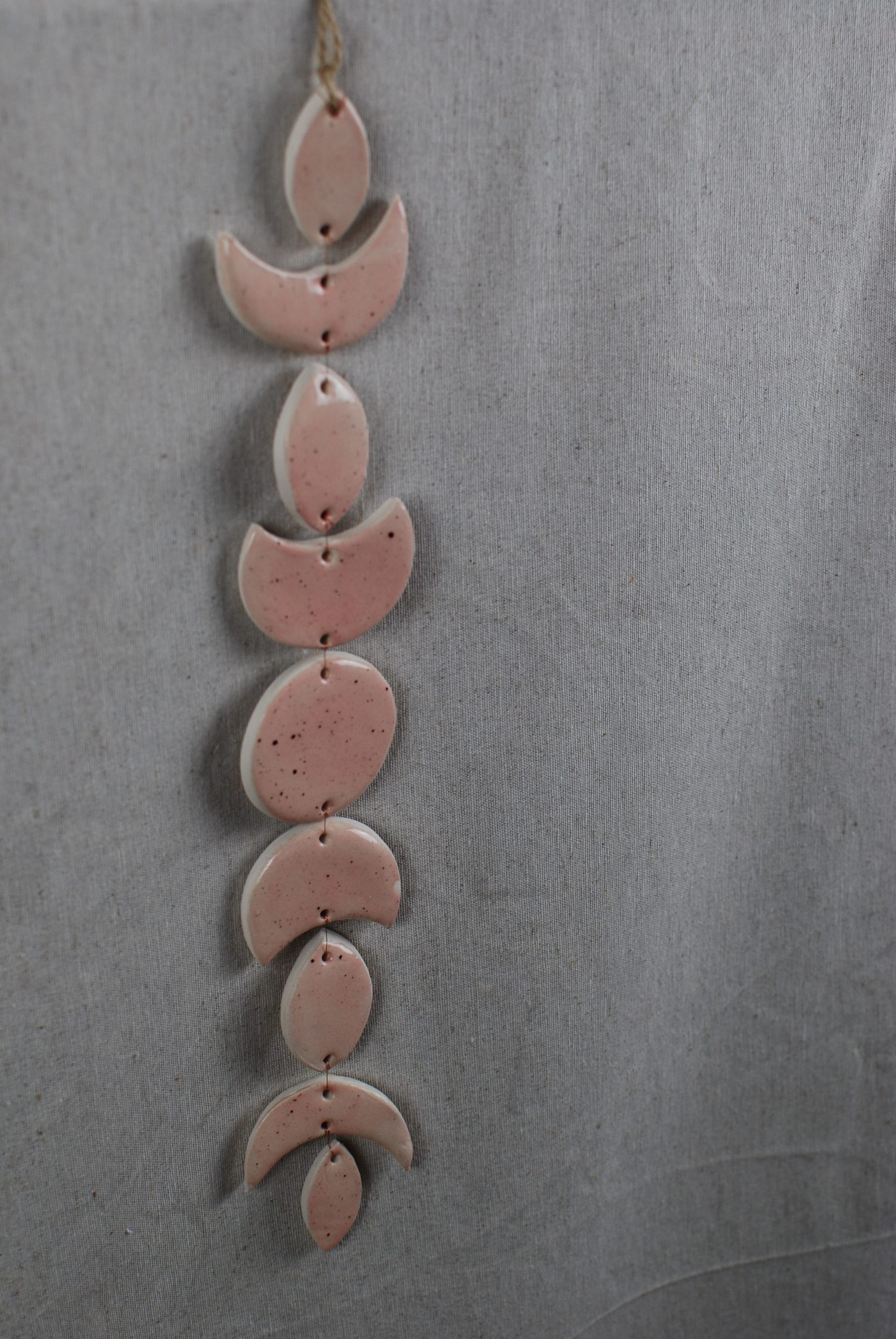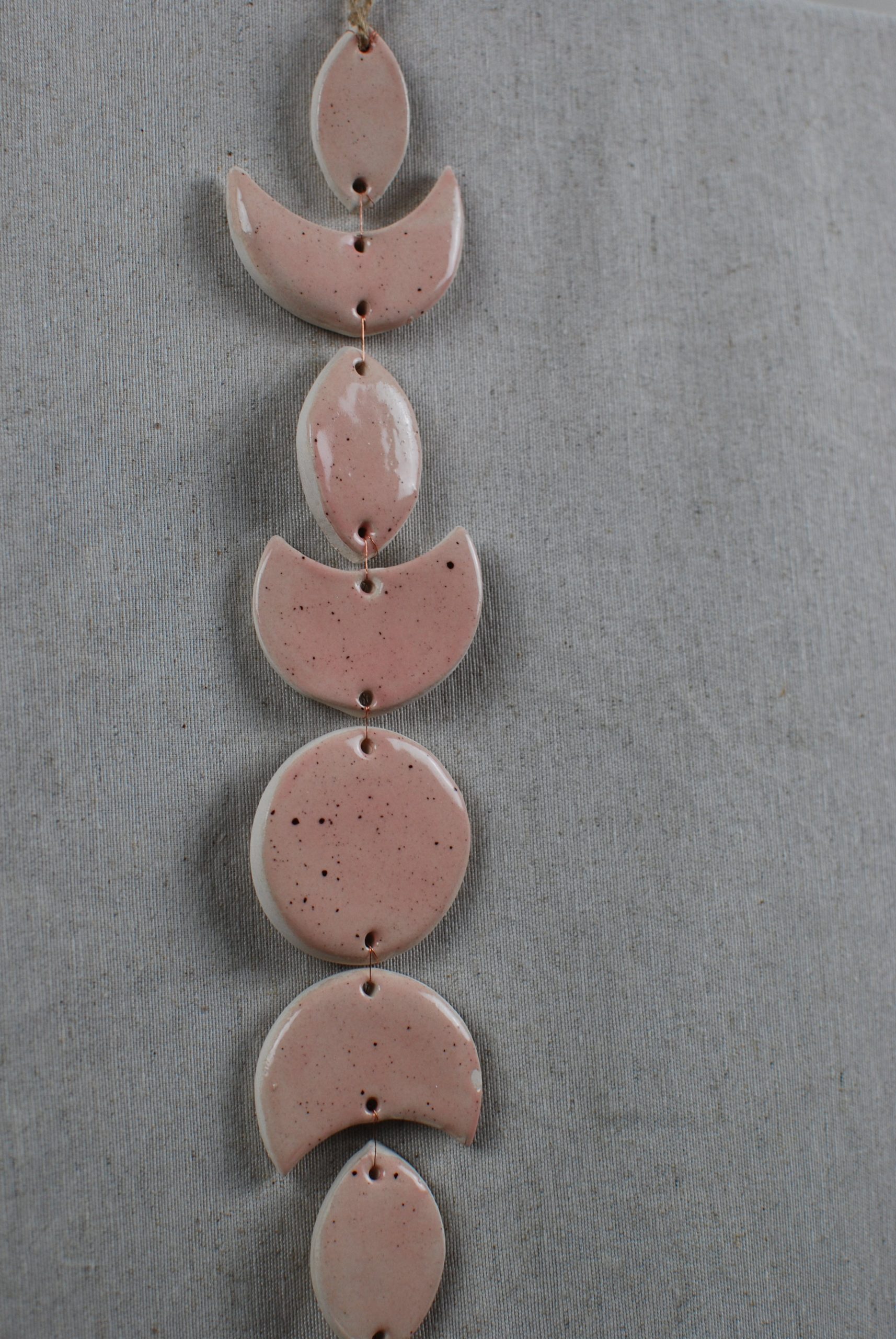 DiseƱo propio de una fase lunar en arcilla de baja temperatura esmaltada con estampado de diversos colores muy llamativos sobre loza blanca. Perfecto para colgar y dar color a una pared.