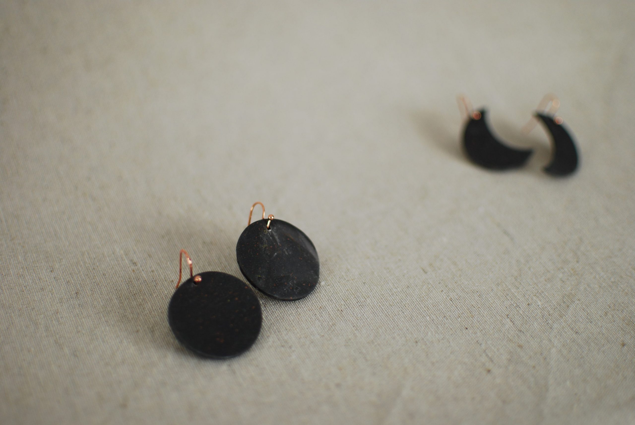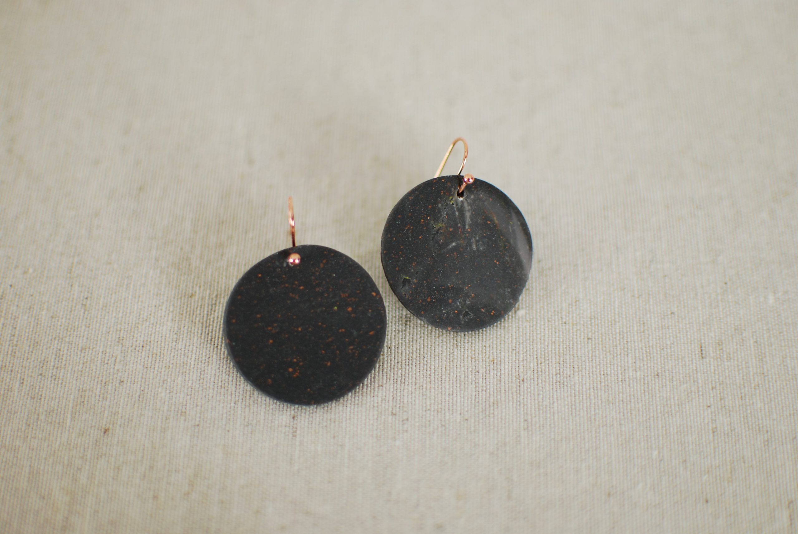 Pendientes de arcilla polimérica con diseño de luna llena dentro de la colección «Moon«, en tono gris y algunos destellos cobrizos.