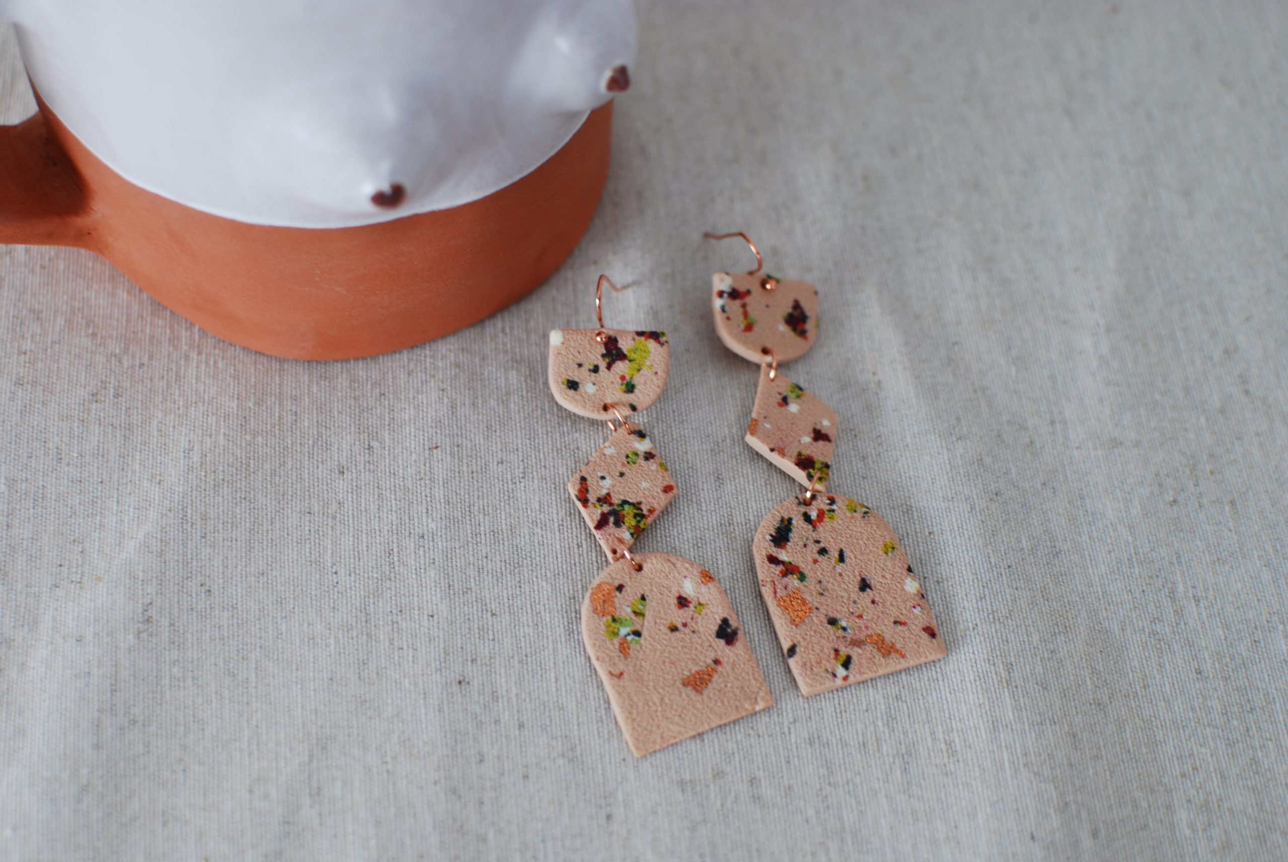 Pendientes en arcilla polimérica con diseño terrazo de variso colores y tonos cobrizos.