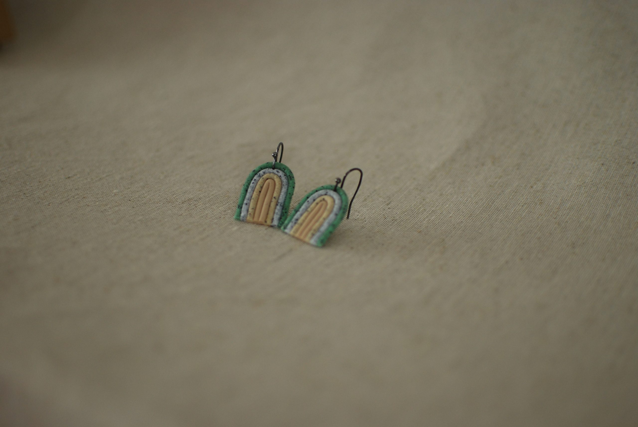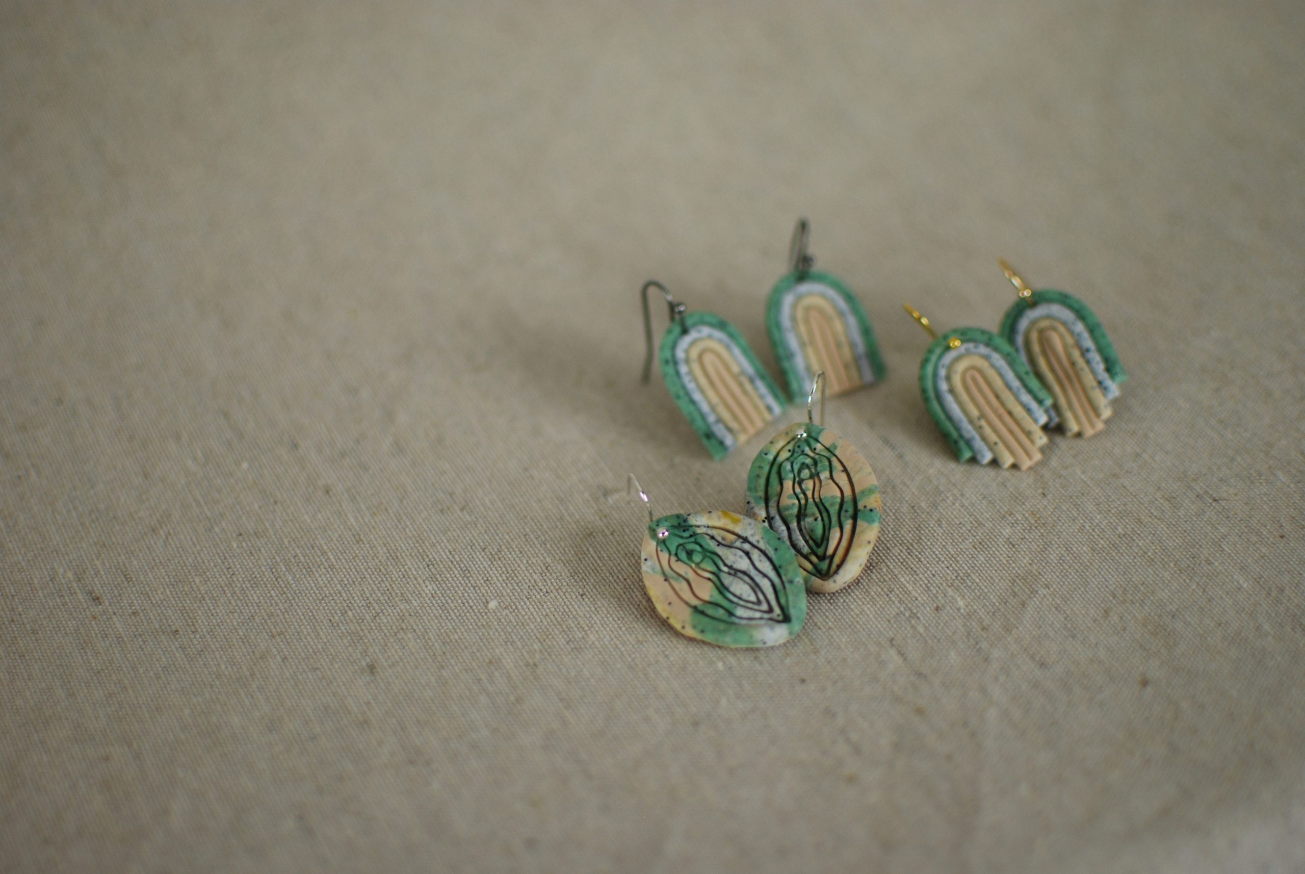 Pendientes de arcilla polimérica en diseño de arco iris en tonos pastel y natural con motas.