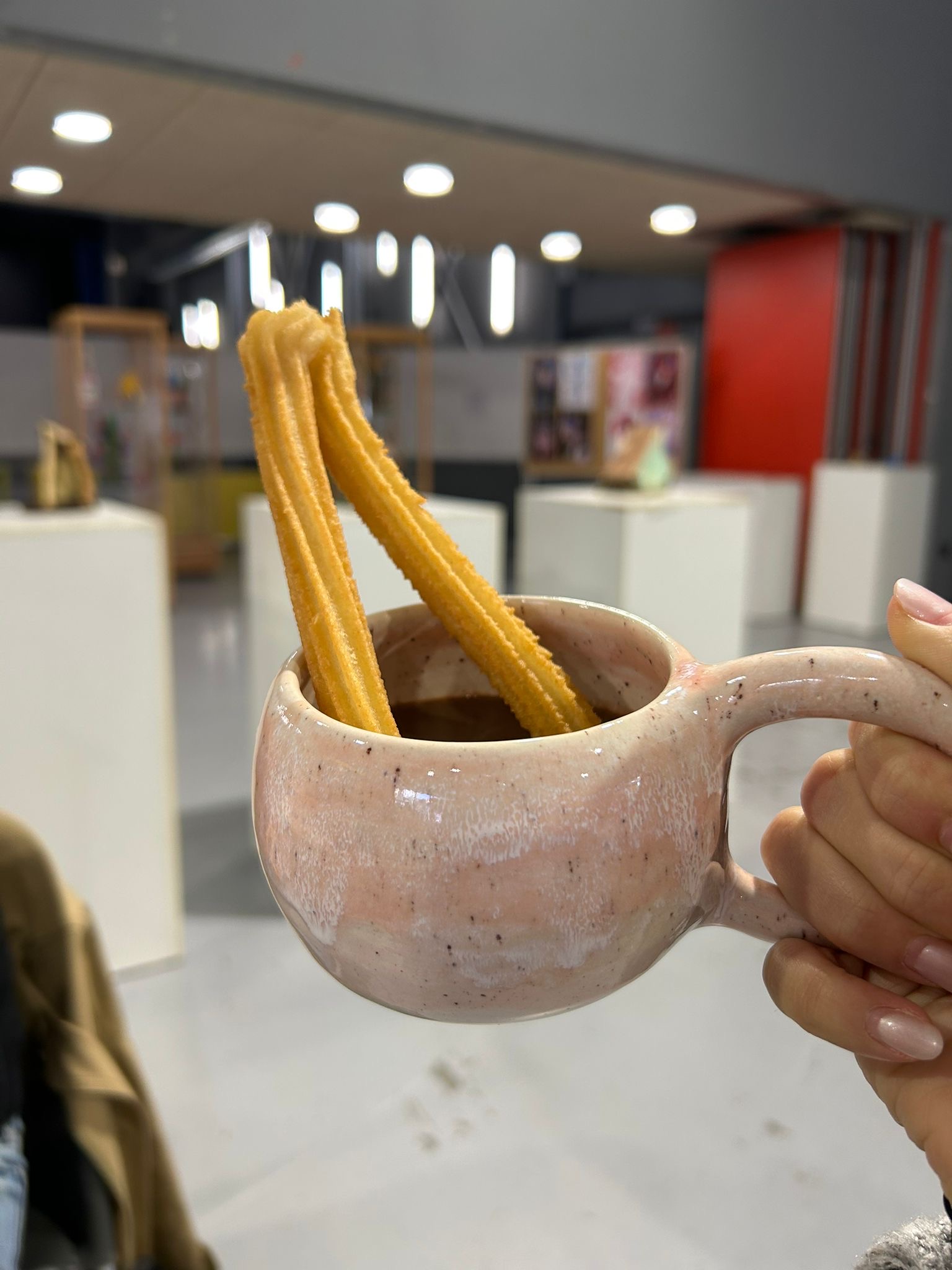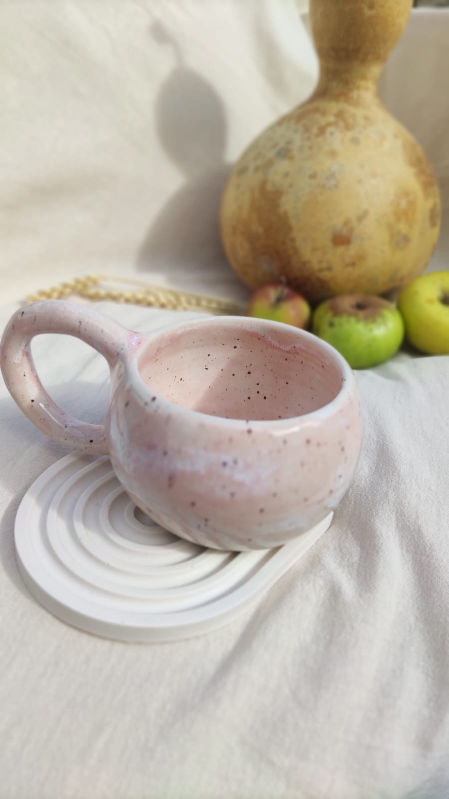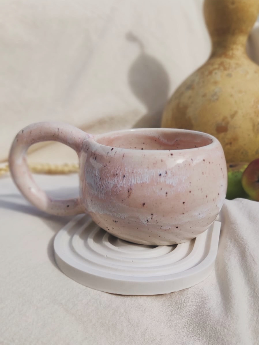 Taza artesanal con forma redondeada, con esmaltes en tonos suaves rosado.