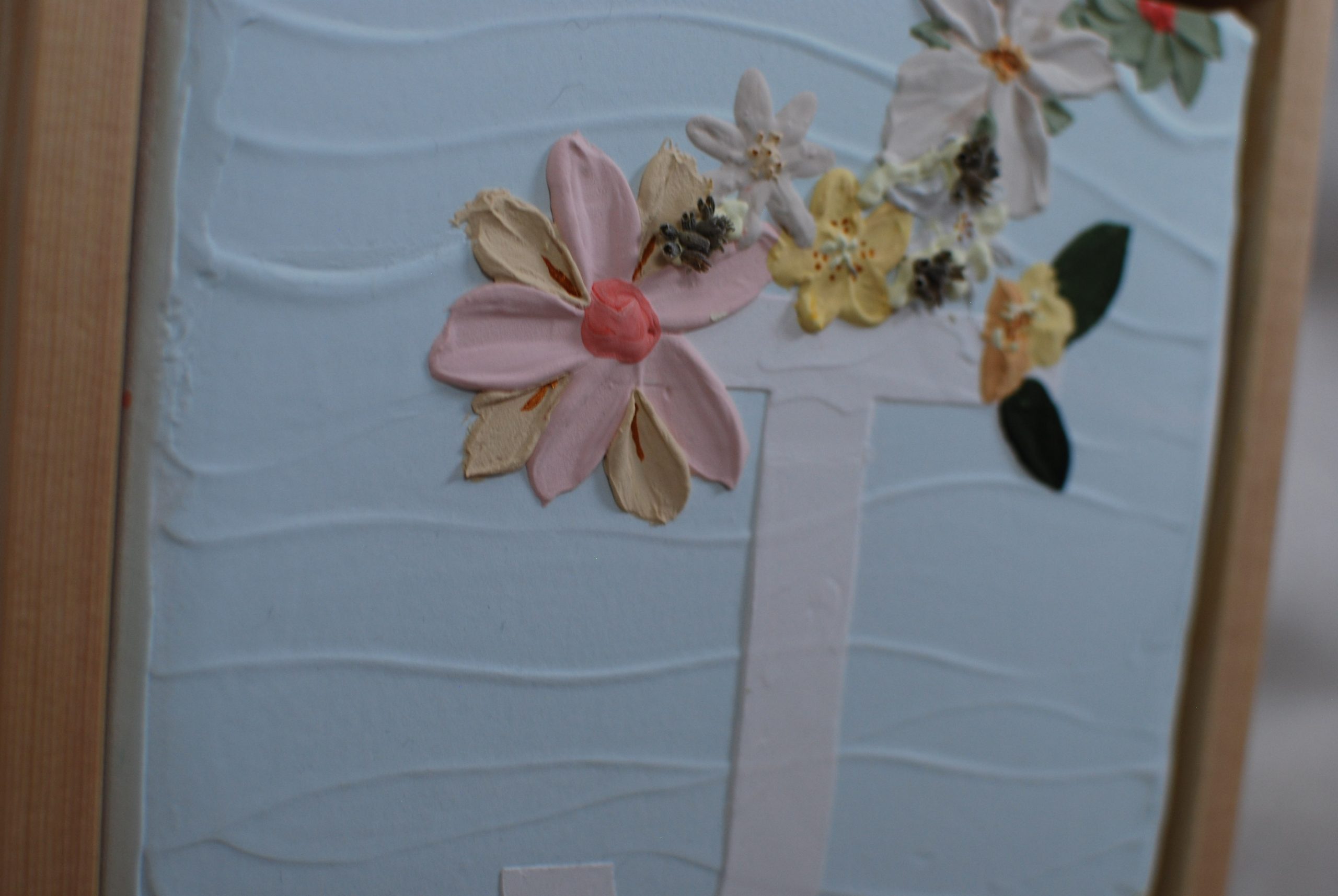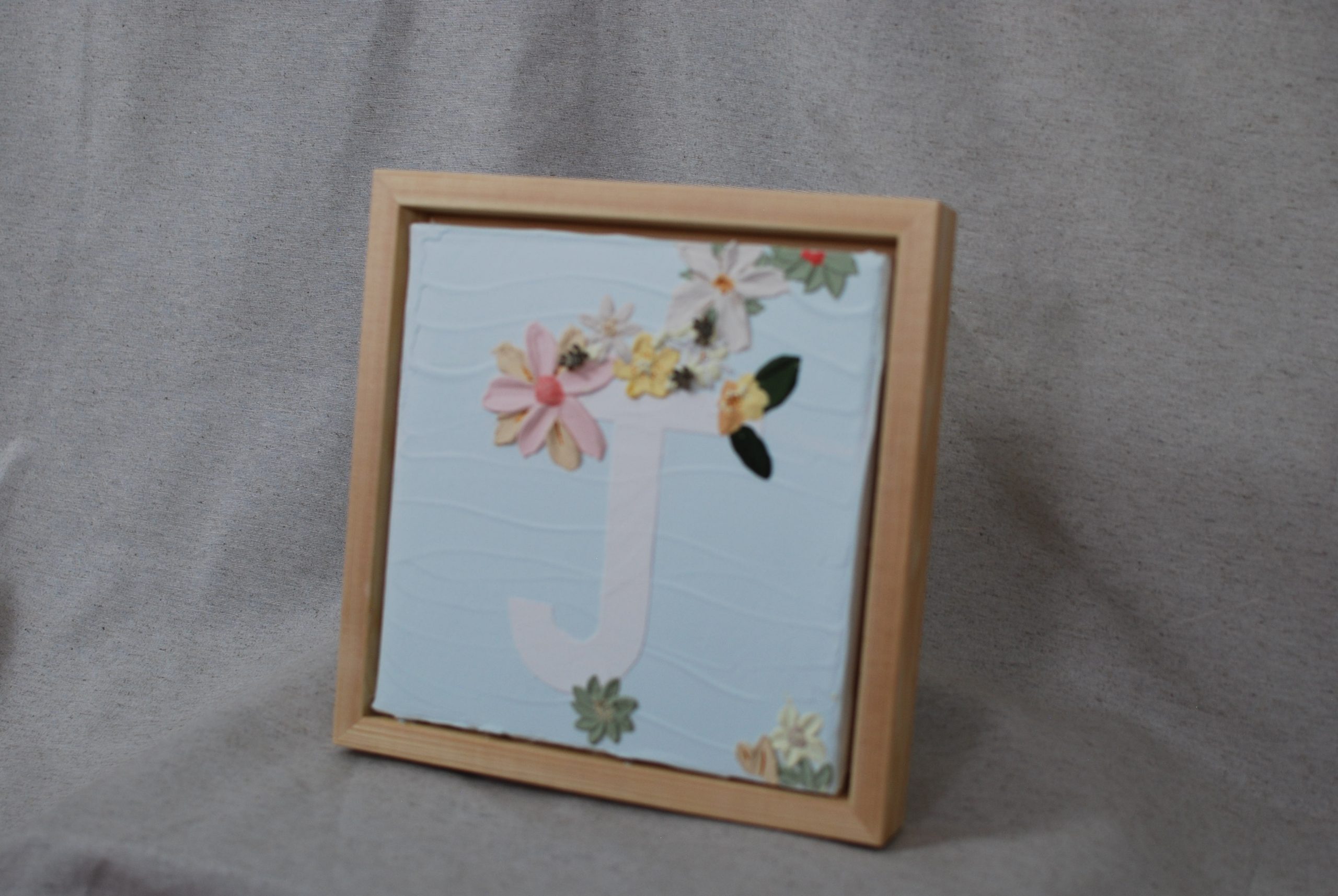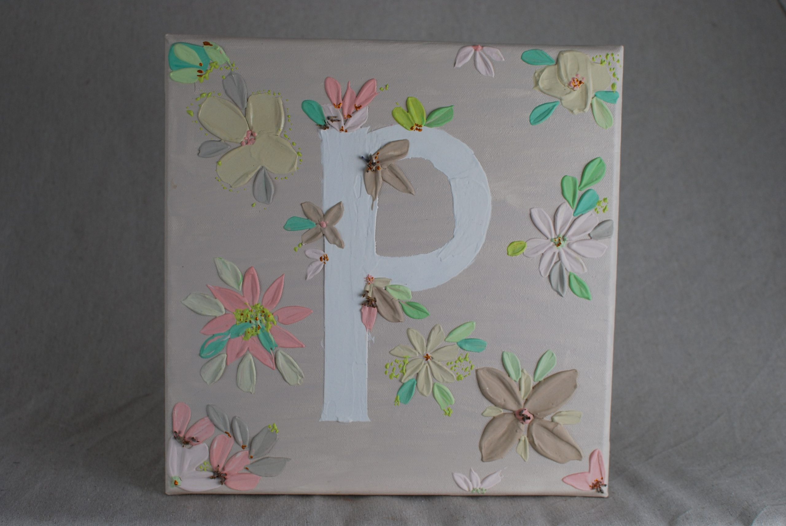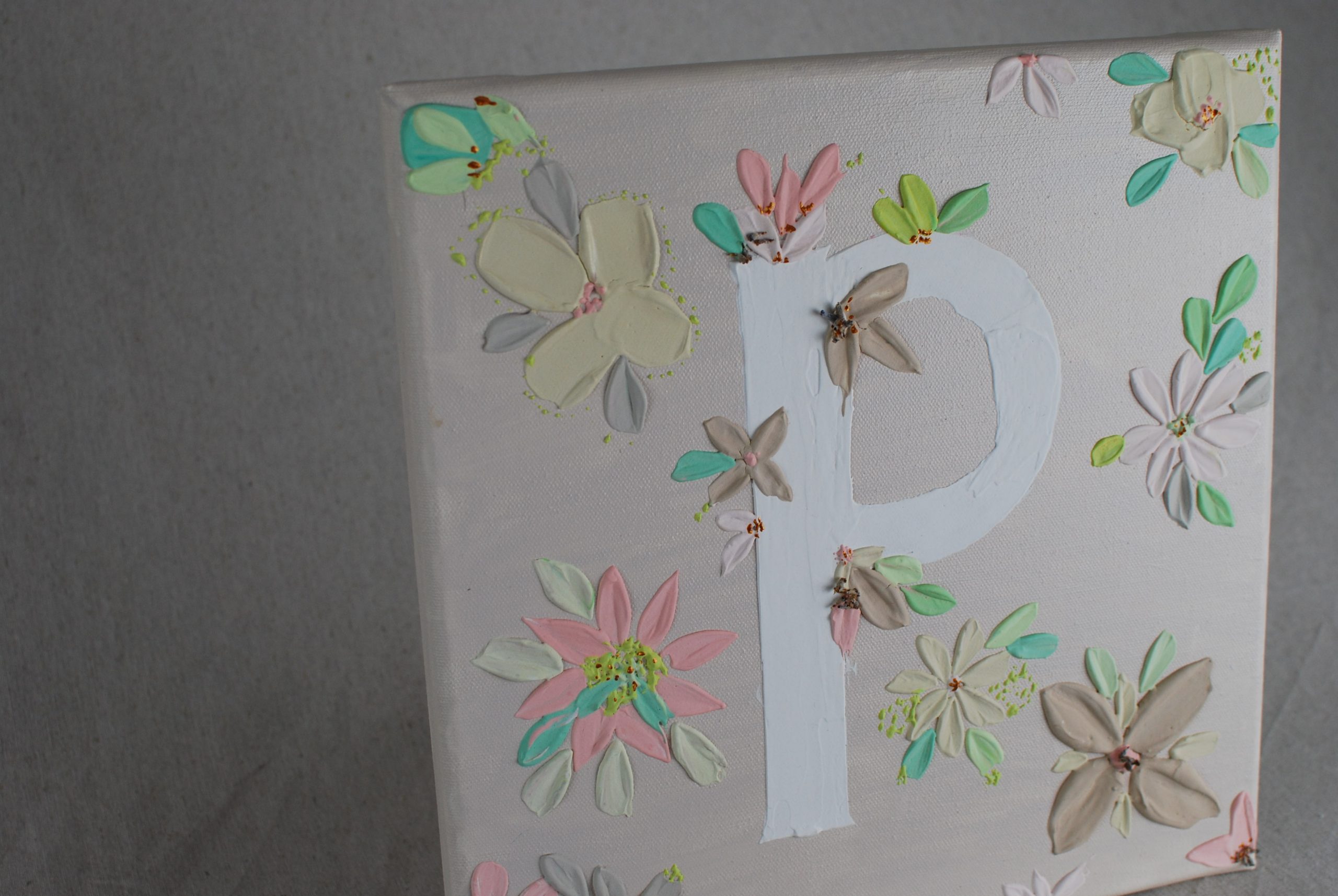 Lienzo sobre bastidor con diseño de letra mayúscula a elegir y flores en tonos pastel.