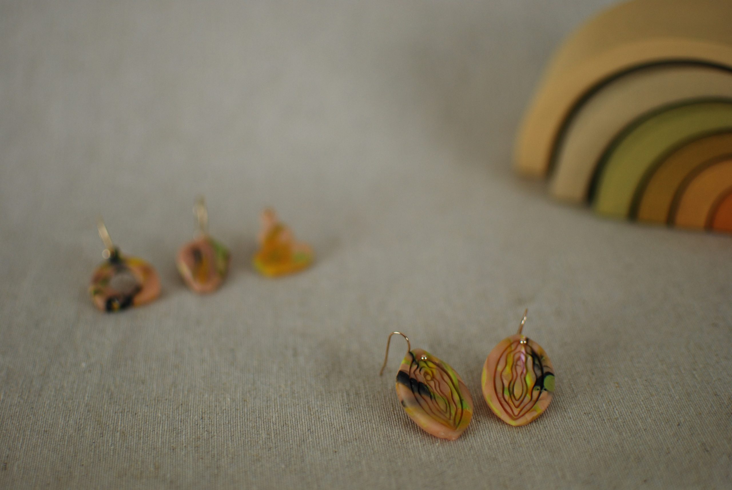 Pendientes de arcilla polimérica en tonos pastel y natural.